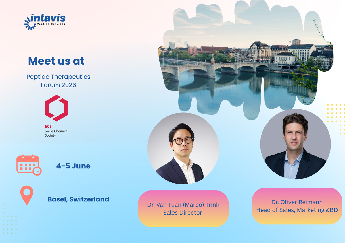 Intavis Peptide Services will be represented at the forum by Dr. Oliver Reimann (Head of Sales, Business Development & Marketing) and Dr. Van Tuan (Marco) Trinh (Sales Director). They will be available to discuss advanced peptide synthesis solutions and support innovation across the entire drug development pipeline.